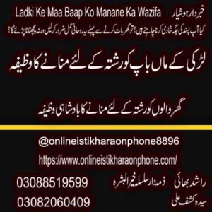 Nazren E Karam Pasand Ki Shadi Karna Aik Sharri Aur Jaiz Amal Hai.aur Islam Is Ki Aam Ijazat Deta Hai .Ab Ham Ladki K Maa Baap Ko Manane Ka Wazifa Aur Amal Btain Gae .Sab Se Pahle Ap Ne Do Rakat Nimaz Salat ul Hajat Nafal Ada Karne K Bad Sadqa Bhi Lazmi Ada Karna Hai .Us K Bad Ap Ne Tanhai Mein Beth k Ya Hube Alam Hazar Kar Butt Kaf Kakra Ka Ya Wadoodu Ya Jabbaru Ya Qahar 313 Bar Kam Az Kam 14 Din Tilawat Karni Hai .