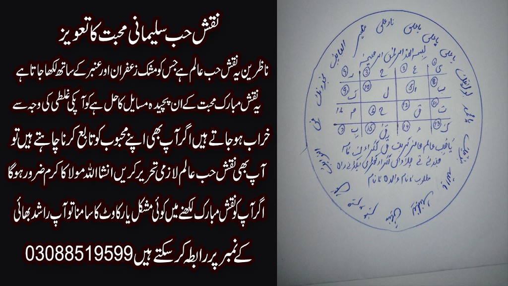 Ab Ham Ap Ko Shohar Ko Apni Taraf Mail Karne Ka Taweez Yani Naqsh Hub e Sulemani Ke Bare Mein Batain Gae . Is Amal Ki Khair o Barkat Aur Allah Ki Rahmat Se Shohar K Dil Se Ghair Aourat Ki Muhbbat Aur Ulfat Aur Chahaht Khatm Ho Jai Gi . Aur Shohar Sirf Aur Sirf Ap Ki Taraf Mail Ho Jai Ga . Agar Is Naqsh Mubarak Ki Ap Ko Mazed Malomat Darkar Hon To Ap Rashid Bhai Ke No Pe Whatsap Kar K Rahnmai Hasil Kar Sakte Hian . Insha Allah Rashid Bhai Ap K Har Masle Ka Hal Mukmal Razdari K Sath Faraham Karein Gae .